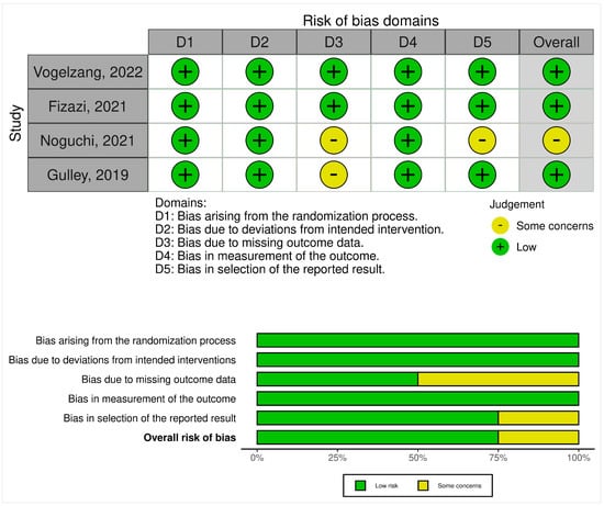 Risk-of-bias assessment of RCTs using the ROB-2 tool. Traffic light plot of study-by-study bias assessment. Weighted summary plot of the overall type of bias encountered in all studies [25,26,27,28].