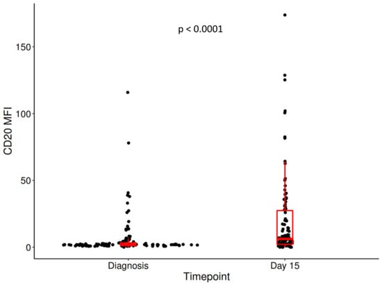 We observed an increase in the MFI of CD20 between diagnosis—1.9 (1.2–3.26) and day 15: 6.17 (2.14–27.4), (p < 0.0001). A significantly increased CD20 percentage at day 15—33.10% (5.24,76.33) compared with diagnosis—1.34 (0.35, 9.34) (p < 0.0001) was identified. The difference between CD20 MFI at day 15 and at diagnosis will be denoted as delta MFI CD20: 2.66 (range, 0.27–17.25) (Figure 1).
