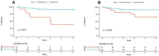 OS was measured from the date of diagnosis to the date of death from any cause. RFS was measured from the date of diagnosis to the date of recurrence from any cause. We established a cut-off for OS regarding MFI CD20 at diagnosis (>8.08), day 15 (>28.65) and delta CD20 (>19.18); and a cut-off for RFS regarding MFI CD20 at diagnosis (>8.08), day 15 (>19.99) and delta CD20 (>15.17). Using these cut-off points, we assessed if the high and low levels of CD20 MFI are associated with RFS and OS and observed that both diagnosis and day 15 CD20 MFI, but not delta CD20 MFI had an impact on RFS (Figure 2 and Figure S2) and OS (Figures S3–S5).