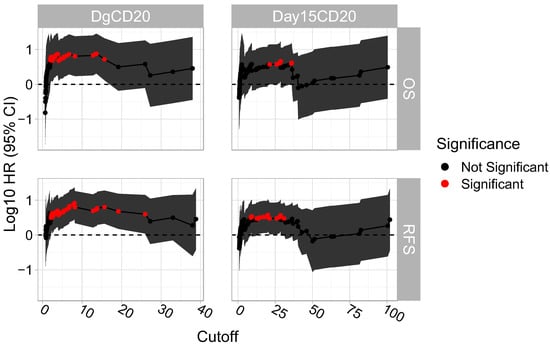 “Sliding window” approach on determining the succession of cut-off points that are significantly associated with RFS and OS. Each possible cut-off point was assessed and their respective log10 HR (95% CI) were plotted.