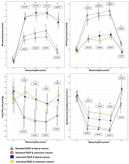 | PEEP5 and Liberal Volume (n = 23) | PEEP5 and Restrictive Volume (n = 27) | PEEPIND and Liberal Volume (n = 24) | PEEPIND and Restrictive Volume (n = 24) | p-Value | |