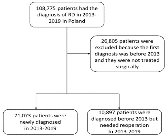 In the period 2013–2019, 71,073 patients with RD were newly diagnosed in Poland and 10,897 patients were diagnosed earlier, but required reoperation during the study period (Figure 1). The average incidence per 100,000 person-years was 32.64 (95% CI: 31.28–33.99) and it increased with the age of patients, from 8.63 in the 19–29 age group to 73.41 in the group of patients ≥70 years of age. The incidence was slightly higher in men when compared to women and the sex distribution differed between RD subtypes. Detailed results are presented in Table 1.