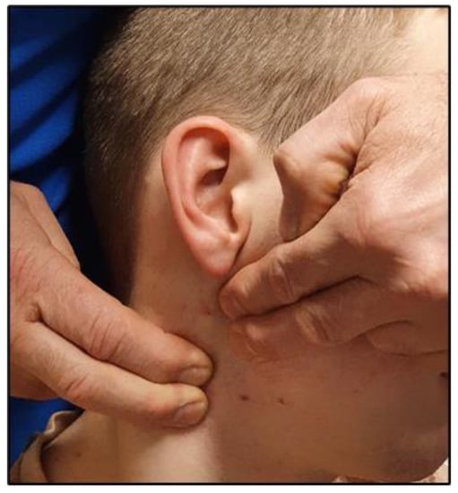 Examiner hand position during the atlas-axis rotational test (A-ART). While standing behind the seated patient, the examiner places both hands on the occipito-cervical junction, opposite the side of head rotation. With the 2nd and 3rd fingers, the examiner’s lower hand (right, in the photograph) is used to stabilize and traction posteriorly against the transverse process of C2. The 2nd and 3rd fingers of the other hand (left, in the photograph) contact the mastoid process of the occiput and lateral mass of the atlas, respectively. The test is then performed with varying angles of cervical rotation, to locate the position that yields maximal movement between C1 and C2, and graded by the amount of C1 versus C2 movement described in the text. For the purposes of the present study, a grade of 0–1 equates to little perceived relative rotational motion between the transverse processes of C1 and C2 (subjectively gauged, less than ~5 mm), and 2 or more exceeds this threshold.