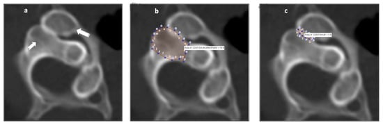 The neutral position scans were first evaluated for significant pathology, which were negative for all patients. To evaluate the atlas-axis facet coverage at maximal rotation, the axial slices that optimized the view of the cortical rim around the facets was used. The joint surface of the superior facet of C2 was then identified, and the online software program GeoGebra Classic (http://www.geogebra.org/) was used to delineate the anatomical perimeter of the articulating surface, as well as quantify the area []. Next, the posteromedial margin of only the part of the inferior articulating surface of C1 that was overlapping with the C2 superior facet surface was outlined, and the area of overlap was calculated by the software as a percentage of the area of the C2 joint surface, see Figure 2a–c.