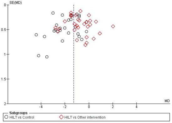 Funnel plot for the comparison of high-intensity laser therapy (HILT) vs. control/another intervention for pain outcome as measured on a VAS.