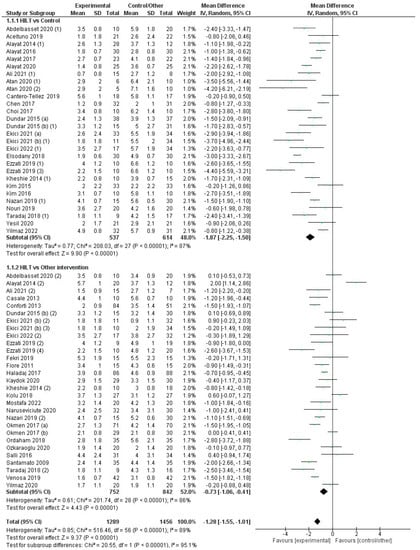 Forest plot for the overall effect on the pain VAS comparing high-intensity laser therapy (HILT) vs. control/another intervention and subgroup analysis depending on the comparator (HILT vs. control/HILT vs. another therapy). For studies with three arms: (1) Comparator: control or sham control. (2) Comparator: another therapy.