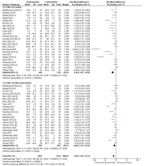 When comparing HILT versus control/sham control groups and other conservative interventions, the overall effect on functionality was superior with HILT (SMD = −1.0; CI95%: −1.4 to −0.7) with a high level of heterogeneity (I2 = 92%; p < 0.001) (Figure 5). The quality of evidence for this outcome according to GRADE was moderate in terms of factors related to rating down (serious risk of bias and serious inconsistency or heterogeneity) and the factor related to rating up (magnitude of effect). In the analysis by subgroups, the difference between HILT and control/sham control (SMD = −1.5; CI95%: −2.0 to −0.9) was significantly greater (χ2 = 5.1; p = 0.02) than that observed when comparing HILT to other conservative treatments (SMD = −0.7; CI95%: −1.1 to −0.2). However, the level of heterogeneity was high (I2 = 92% and 93%, respectively; p < 0.001) in both subgroups (Figure 5).