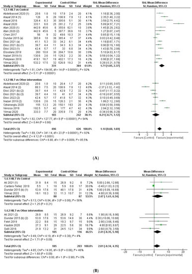 (A) Forest plot for the overall effect on range of motion (ROM) comparing high-intensity laser therapy (HILT) vs. control/another intervention and subgroup analysis depending on the comparator (HILT vs. control/HILT vs. another therapy); (B) forest plot for the overall effect on strength comparing high-intensity laser therapy (HILT) vs. control/another intervention and subgroup analysis depending on the comparator (HILT vs. control/HILT vs. another therapy). For studies with three arms: (1) Comparator: control or sham control. (2) Comparator: another therapy.
