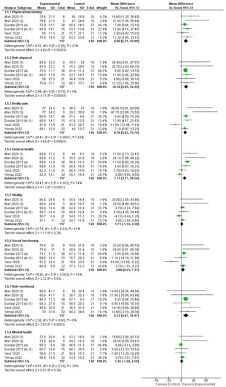 Forest plot for the overall effect on quality-of-life assessment by SF-36 questionary comparing high-intensity laser therapy (HILT) vs. control.