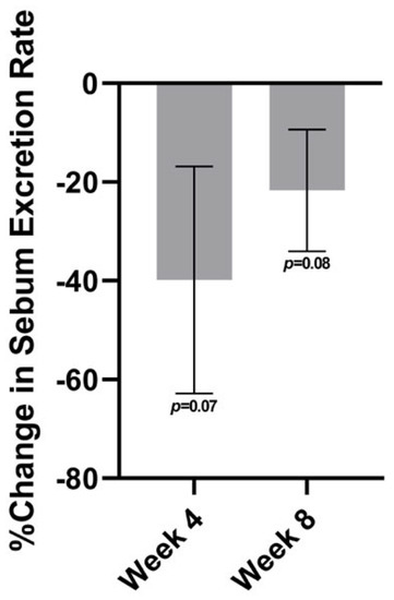The sebum excretion rate was found to have a decreasing trend on the forehead at both follow-up visits relative to baseline (Figure 4). From baseline to week 4, the average percent change was nearly a 40% reduction on the forehead (p = 0.07) and nearly a 35% reduction on the cheeks (p = 0.08). At week 8, there was a decrease in sebum excretion of about 22% on the forehead (p = 0.08).