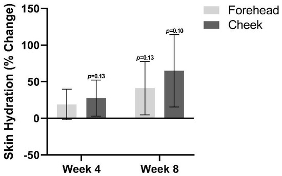 Skin hydration trended towards an increase at both follow-up visits relative to baseline (Figure 5). By week 4, there was an average increase in skin hydration of 19.1% on the forehead (p = 0.19) and an increase of 27.6% on the cheeks (p = 0.14). At week 8, a 41.1% increase in skin hydration was found on the forehead (p = 0.14), and a 65% increase was found on the cheek (p = 0.10).