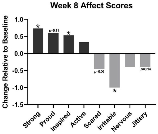Components of positive effects (strong, proud, inspired, active) and negative effects (scared, irritable, nervous, jittery) at week 8 relative to baseline. * = p < 0.05.