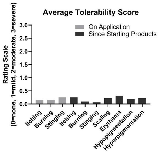 At week 4 and week 8 visits, tolerability was evaluated using an 11-question survey inquiring about potential symptoms (i.e., itching, burning, stinging, scaling, redness, hypo- or hyperpigmentation) experienced with the product use. Participants were asked to rate these symptoms on a 3-point scale, with “0” indicating none, “1” as mild, “2” as moderate, and “3” as severe.