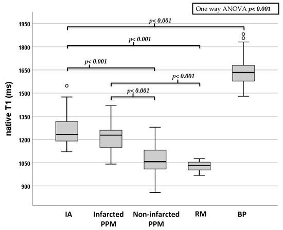 Box plot graph showing the nT1 values of the different ROIs placed in the myocardium and PPMs. Error bars represent the 95% confidence interval (CI), and the top and the bottom of the boxes represent the third and the first quartiles, respectively. p-values were calculated with one-way ANOVA and Bonferroni post-hoc analysis and considered significant when <0.05. ANOVA: analysis of variance; ms: milliseconds; IA: infarcted area; RM: remote myocardium; BP: blood pool.