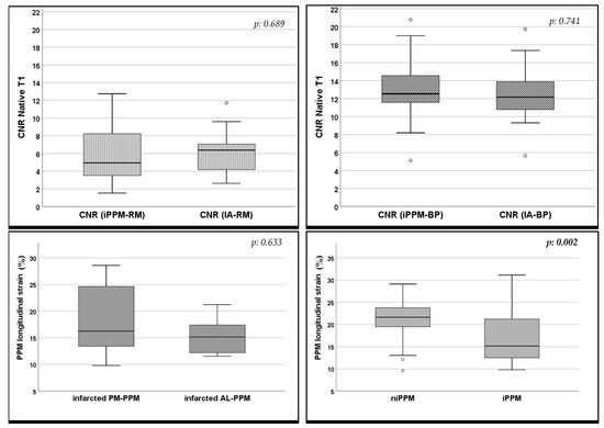 All of the CNR values calculated in the T1 maps are reported in Table 4. The comparisons between the CNR of the infarcted-PPM and the IA did not show any significant difference for both the/BP and/RM CNRs (p: 0.741 and 0.689, respectively), as shown in Figure 4.