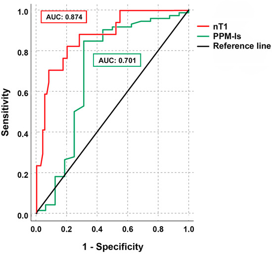 ROC analysis (Figure 6) showed that nT1 proved to have an excellent discriminatory power with an area under the curve (AUC) of 0.874 (95% confidence interval: 0.784–0.963, p < 0.001), and an accuracy rate of 74%. The PPM-ls had an inferior diagnostic performance with an AUC = 0.701 (95% confidence interval: 0.523–0.878). The Youden test was performed to individuate the best nT1 and PPM-ls cut-off values, in order to diagnose the iPPM, which resulted in being 1191.5 (sensitivity: 71%, specificity: 92%) and 17.8% (sensitivity: 85%, specificity: 69%), respectively.