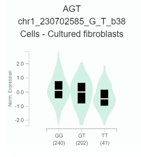 To determine whether rs7079 could lead to change of AGT gene expression, the GTEx database was used to verify the correlation between rs7079 G>T and AGT mRNA expression. The results showed that the rs7079 T allele was significantly related to the decrease of AGT expression level in cultured fibroblasts (p = 0.000099) (Figure 1).