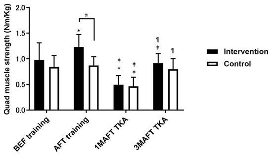 Comparison of quadriceps muscle strength between the intervention and control groups. Data are presented as mean ± standard deviation. *, p < 0.05, compared with BEF training; ‡, p < 0.05, compared with AFT training; ¶, p < 0.05, compared with 1M AFT TKA; #, p < 0.05, compared with the control group. BEF, baseline 3 weeks before surgery; AFT, after 3 weeks of preoperative training; M, month; TKA, total knee arthroplasty. Data are presented as mean ± standard deviation.