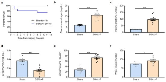 Eleven-week survival after surgery (a), plasma creatinemia (b), urea nitrogen (c), glomerular filtration rate (GFR, d), urinary volume (e), and water intake (f) measured 10 to 11 weeks after surgery in sham-operated and 5/6 nephrectomized rats receiving a high-phosphate diet (5/6Nx + P). * p < 0.05, **** p < 0.0001.