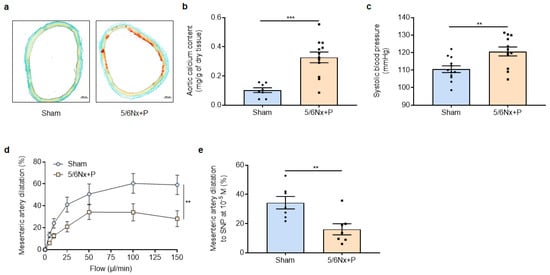 At the vascular level, 5/6Nx + P rats displayed aortic calcification, as shown by the increase in aortic calcium content and Alizarin red staining compared to sham-operated rats (Figure 2a,b). This was associated with the presence of systemic hypertension as well as vascular dysfunction, as shown by the impairment of both mesenteric artery endothelium-dependent and -independent dilatation (shown in Figure 2c–e).