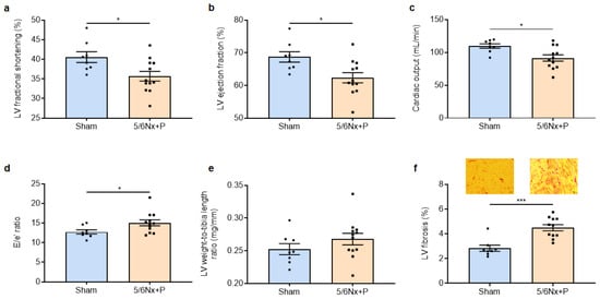 Left-ventricular (LV) fractional shortening (a), ejection fraction (b), cardiac output (c), E/e’ ratio (mitral inflow E wave/e’ tissue Doppler mitral annulus velocity) (d), LV weight-to-tibia length ratio (e), and representative images of Sirius red-stained LV sections and level of fibrosis (f) obtained 10 to 11 weeks after surgery in sham-operated and 5/6 nephrectomized rats receiving a high-phosphate diet (5/6Nx + P). * p < 0.05, *** p < 0.001.