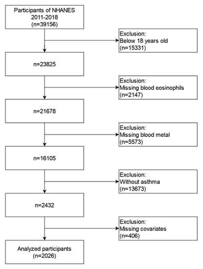 Four cycles of NHANES data (2011–2012, 2013–2014, 2015–2016 and 2017–2018) were integrated into our study. These data included demographic data, examination data, laboratory data, and questionnaire data for the second analysis. A total of 39,156 participants were included in the NHANES from 2011 to 2018. We excluded individuals: (1) aged < 18 years old (n = 15331); (2) missing blood eosinophil data (n = 2147); (3) missing blood Pb, Cd, Hg, Se, and Mn data (n = 5573); (4) participants without asthma (n = 13673); (5) missing data about covariates in at least one of following (n = 406): education level, marital status, the ratio of family income to poverty, BMI, smoking status, hypertension history, diabetes history, blood urea nitrogen, blood creatinine and blood cotinine. Eventually, a large nationally representative sample (n = 2026) of American adults with asthma was enrolled in our study. The flow chart of the screening process is shown in Figure 1.