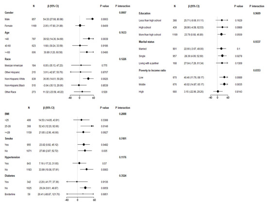 Stratified association of blood Pb on blood eosinophil counts in the prespecified and exploratory subgroups. Above adjusts for gender, age, race/ethnicity, education level, marital status, poverty to income ratio, BMI, smoked at least 100 cigarettes in life, hypertension, diabetes, blood urea nitrogen, blood creatinine and blood cotinine. In each case, the model was not adjusted for the stratification variable itself.