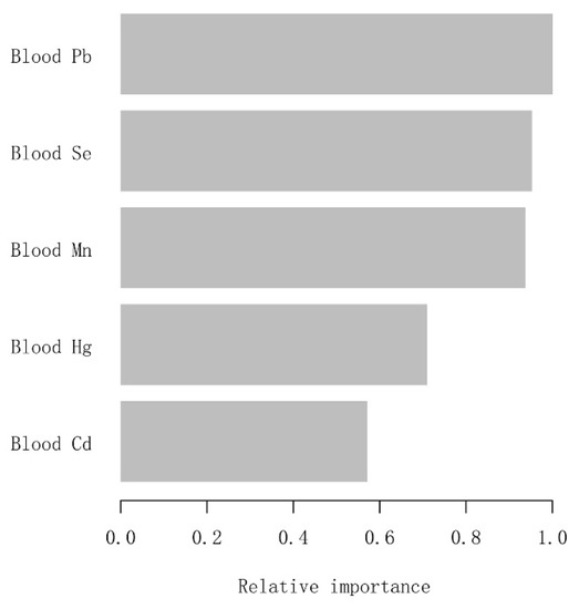 3.4. Using Machine Learning from the XGBoost Algorithm Model to Explore the Blood Metals’ Relative Importance