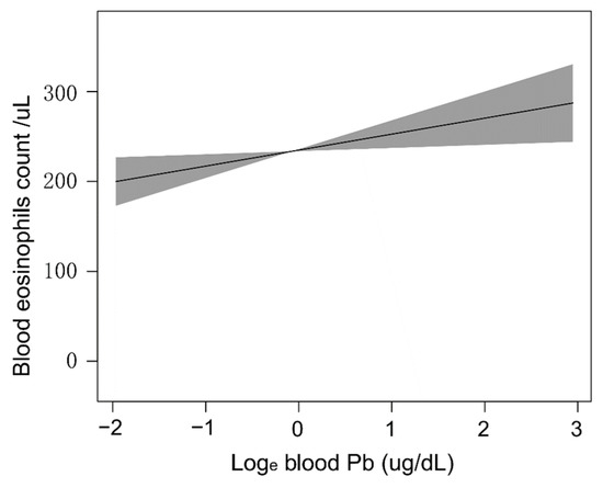 Dose-response relationships of blood Pb concentrations with blood eosinophil counts. The solid line and shadow area represented the corresponding β values and 95% confidence intervals.