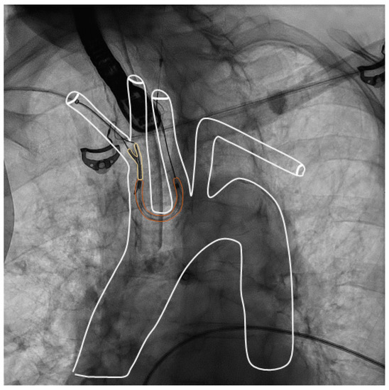 The Sentinel device in standard position, covering the brachiocephalic and left common carotid artery. Anteroposterior view. Aortic arch and supraaortic vessels are depicted in white, the device is depicted in yellow for better visibility.