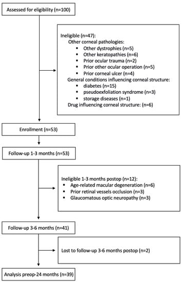 A total of 100 pseudophakic eyes in 100 patients with bullous keratopathy due to FECD were recruited for this prospective study. All patients were diagnosed with initial stage FECD prior to cataract surgery and decompensated henceforth (inclusion criterion). Exclusion criteria included coexisting pathologies with abnormal corneal transparency (Figure 1). Following the study protocol (Figure 1), data from 39 eyes were finally analyzed (12 men, 27 women; mean age 76 years, range 57–89 years), all Caucasian. Mean time from cataract surgery to corneal decompensation was 32.1 months (range 0–120), mean time from corneal decompensation to DSEK surgery was 10.2 months (range 3–29).