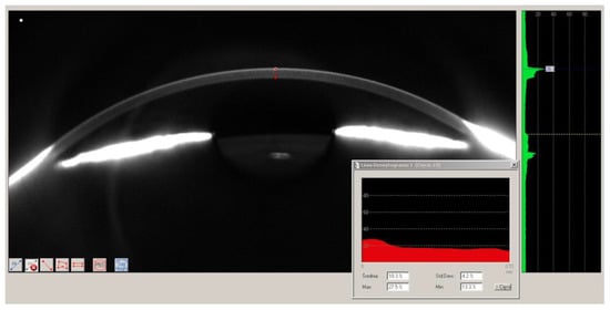 Pentacam (Oculus, Germany) was the first commercially available device using this technology. A digital Scheimpflug corneal tomography provides 50 three-dimensional tomograms of the anterior segment of the eye in different meridians using 475-nm-long monochromatic slit light. Analysis of 138,000 true elevation points enables anterior and posterior surface mapping and pachymetry. Corneal pachymetry and densitometry were evaluated by Pentacam HR using a single measurement of 50 scans in different meridians. A manual analysis of the corneal densitometry was conducted from the outermost epithelium layer to the innermost edges of the endothelial cells on scans in four meridians (180–0, 270–90, 225–45, and 135–315 degrees) performed in the optical axis (corneal center). The results are shown in GSU from 0 (highest transparency, lowest optical density) to 100 (lowest transparency, highest optical density). Due to variability in results according to corneal depth (higher in the anterior layers) and different FECD stages in the study group (more expressed in the inner layers and in the center), we analyzed the mean densitometry over the entire depth of the cornea in the central optical zone in the four meridians (Figure 2).