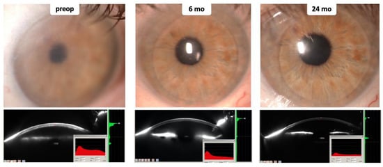 The complete ophthalmic examination included best corrected visual acuity (BCVA) measurements in Snellen converted to logMAR, biomicroscopy (SL 980 3X, Digital Vision R, Costruzione Strumenti Oftalmici, Firenze, Italy; Sony CCD 1392 × 1040 pixels), Scheimpflug corneal tomography (Pentacam HR, Oculus GmbH, Germany), and assessment of the endothelial cell density (SP 3000P, Topcon, Tokyo, Japan). All measurements were taken preoperatively and within a 2-year follow-up period (1, 3, 6, 12, 18, and 24 months postoperatively).