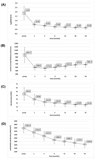 The normality of the variable distribution was evaluated with the Shapiro–Wilk test, and the statistical characteristics are presented as percentage values and arithmetic means with standard deviations. Error bars in the graphical representation of results indicate standard errors and standard deviations. Levene’s test was used to check the homogeneity of variances in the analyzed samples. The effects of follow-up time on BCVA, CCT, and ECD were evaluated using Friedman’s ANOVA or one-way ANOVA repeated measurements, depending on the distribution characteristics of the analyzed variables. If significant differences were observed by ANOVA, post hoc pair-wise comparisons were performed using Dunn’s or Scheffe’s test, where appropriate. Correlations between variables were analyzed using Spearman’s coefficient model. Percentage proportion data were tested using the chi-square test. Bonferroni correction was applied if appropriate. The level of significance for all tests was set at p < 0.05. All calculations were conducted using the STATISTICA 13.0 PL statistical package (StatSoft, Kraków, Poland).