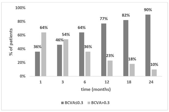 Stabilization of visual function was established as BCVA ≤ 0.3 logMAR maintained within a further follow-up period. This value was chosen based on the standard World Health Organization definition of visual impairment (mild or no visual impairment for BCVA ≤ 0.5) according to the mean BCVA in the study group. The percentage of eyes achieving BCVA ≤ 0.3 at each time point of the study is shown in Figure 5, with corresponding statistical significance values displayed in Table 2.