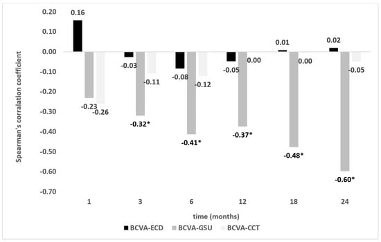 Spearman’s correlation coefficients between BCVA and other analyzed parameters (densitometry, CCT, and ECD) in the postoperative period. * denotes significant differences (p < 0.05). BCVA, best corrected visual acuity; CCT, central corneal thickness; ECD, endothelial cell density; GSU, grayscale units.