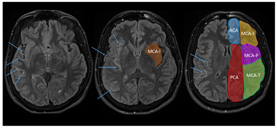 Examples of FHVs (indicated by the arrows) and vascular regions used for the NIH-FHV score: the anterior cerebral artery (ACA, blue), posterior cerebral artery (PCA, red), and four regions of the middle cerebral artery (MCA)—the MCA-frontal (MCA-F, orange), MCA-temporal (MCA-T, green), MCA-parietal (MCA-P, purple), and MCA-insular (MCA-I, brown). Note that no FLAIR imaging for the current study was shared by the NIH. Thus, this example of FHVs is from a participant in Bunker et al. [13].