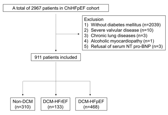 The ChiHFpEF cohort is a prospective study of HFpEF in 2967 Han Chinese patients with documented CVDs in Nanjing First Hospital (NCT05278026). After screening according to the inclusion and exclusion criteria, 911 patients from January 2014 to June 2022 with DM were included in the final analysis (Figure 1). Patients were recruited in this study if they were (1) ≥18 years old; (2) with type 2 diabetes (T2DM), which was confirmed if any of the following can be met: (a) fasting plasma glucose (FPG) ≥ 126 mg/dL (7.0 mmol/L), and fasting means no caloric intaking for at least 8 h; (b) 2 h plasma glucose (PG) ≥200 mg/dL (11.1 mmol/L) during oral glucose tolerance test (OGTT); (c) HbA1C ≥ 6.5% (48 mmol/mol); (d) suffering from hyperglycemic crisis or having classic symptoms of hyperglycemia, along with a random plasma glucose ≥200 mg/dL (11.1 mmol/L) [8]. Patients were excluded if they were (1) first diagnosed with type 1 diabetes (T1DM); diabetes secondary to other specific causes or women who were pregnant or breastfeeding; (2) patients with acute coronary syndromes or with hemodynamics significant (moderate to severe) heart valvular diseases; (3) patients with chronic lung diseases, aortic dissection, peripheral vascular diseases, pericardial diseases, myocarditis, hypertrophic cardiomyopathy, cardiophobia, costal chondritis, shock or thyroid diseases; (4) patients with infections in need of antibiotics; (5) patients with a previous history of malignancies.