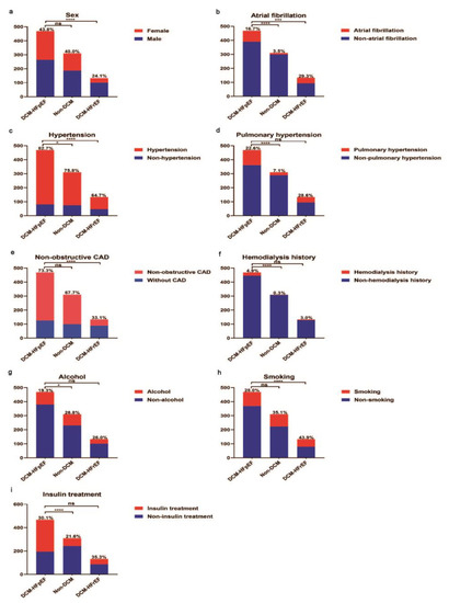 Comparison of demographic information during hospitalization of DCM-HFpEF vs. non-DCM and DCM-HFrEF vs. DCM-HFpEF patients. (a) Gender differences between DCM-HFpEF and non-DCM patients were not obvious. Compared with DCM-HFrEF patients, DCM-HFpEF patients were more likely to be female. (b) DCM-HFpEF patients had a higher proportion of atrial fibrillation vs. non-DCM and a lower proportion of atrial fibrillation vs. DCM-HFrEF. (c) Patients had a higher proportion of hypertension in DCM-HFpEF vs. non-DCM and DCM-HFrEF. (d) Patients had a higher proportion of pulmonary hypertension in DCM-HFpEF vs. non-DCM, but differences between DCM-HFpEF and DCM-HFrEF were not obvious. (e) Patients had a higher proportion of non-obstructive CAD in DCM-HFpEF vs. DCM-HFrEF. (f) Patients had a higher proportion of hemodialysis history in DCM-HFpEF vs. non-DCM. (g) DCM-HFpEF patients had a lower proportion of alcohol assumption vs. non-DCM. (h) DCM-HFrEF patients had a higher proportion of smoking assumption vs. DCM-HFpEF. (i) DCM-HFpEF patients had a higher proportion of insulin treatment vs. non-DCM. CAD: coronary artery disease; DCM: diabetic cardiomyopathy; HFrEF: heart failure with reduced ejection fraction; HFpEF: heart failure with preserved ejection fraction. * p < 0.05. *** p < 0.005. **** p < 0.001.