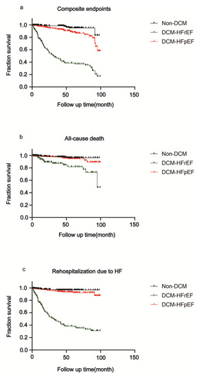 In patients of DCM-HFrEF, 16 (12.0%) deaths occurred (HR 2.99, 95% CI 1.37–6.55, p = 0.0061), compared with DCM-HFpEF patients. A total of 66 (49.6%) rehospitalizations due to HF occurred in DCM-HFrEF patients (HR 30.46, 95% CI 18.07–51.32, p < 0.0001), compared with DCM-HFpEF patients. The composite endpoints occurred in 71 (53.4%) DCM-HFrEF patients (HR 11.76, 95% CI 7.47–18.52, p = 0.0021) as compared to DCM-HFpEF patients.
