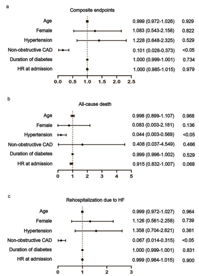 Multivariable Cox proportional hazards regression implicated that non-obstructive CAD was a negative predictor for both composite endpoint (HR 0.101, 95% CI 0.028–0.373, p = 0.001) and rehospitalization due to HF (HR 0.067, 95% CI 0.014–0.315, p = 0.001) of DCM-HFrEF patients (Figure 5). Hypertension was also a negative predictor for the death of DCM-HFrEF patients (HR 0.044, 95% CI 0.003–0.569, p = 0.017) (Figure 5). Age was a positive predictor for both composite endpoint (HR 1.044, 95% CI 1.007–1.082, p = 0.018) and death (HR 1.101, 95% CI 1.030–1.177, p = 0.004) of DCM-HFpEF patients (Figure 6).