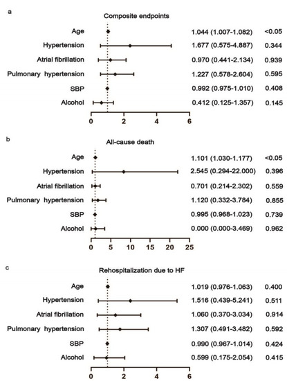 Association between risk factors and prognosis in DCM-HFpEF patients. Age was a positive predictor for both a composite endpoint (a) and death (b) of DCM-HFpEF patients. SBP: systolic blood pressure. (c) No association was found between these risk factors and prognosis in DCM-HFpEF patients.