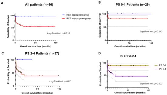 Kaplan–Meier analyses showed that RCT appropriate group had a significantly longer OS than RCT inappropriate group (Figure 1A). In terms of performance status, the patients with PS 0-1 displayed a significant longer OS than those with PS 2-4 (Figure 1B). The RCT appropriate group with PS 0-1 had a longer OS than RCT inappropriate group with PS 0-1, even though there was no significance (p = 0.143 by Log-Rank test) (Figure 1C). Nevertheless, the RCT appropriate group with PS 2-4 showed an almost significantly longer OS than RCT inappropriate group (p = 0.07 by Log-Rank test) (Figure 1D).