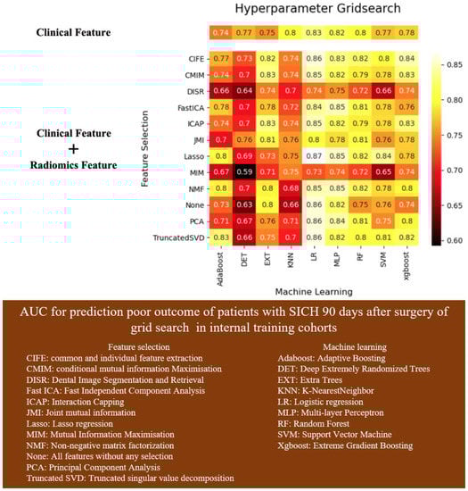NCCT can quickly and accurately detect sICH, which is convenient to scan and sensitive to bleeding. It is the first choice for emergency suspected sICH [4]. Our previous study found that NCCT imaging features such as IVH, MLS, and deep ICH were closely related to the postoperative prognosis of patients with sICH [5]. In addition, some studies have pointed out that the special signs found on the NCCT, such as spot sign, vortex sign, hypodensity sign, and black hole sign, are related to hematoma enlargement [6,7,8,9]. Radiomics refers to the high-throughput extraction of quantitative radiomics features from medical images and the use of statistical methods to select them, so as to find out the imaging information with important value for disease diagnosis, efficacy evaluation, and prognosis prediction [10]. ML can complete various tasks such as disease diagnosis, classification, and prognosis prediction through the analysis and processing of big data [11]. Seyedmehdi Payabvash et al. [12] published a research abstract in the journal Stroke. They used ML classifiers to predict the 90-day Modified Rankin Scale (mRS) Score of patients with ICH based on radiomics and compared the performance of different feature selection algorithms and ML classifiers. They found that the combination of radiomics features with clinical features improved model performance. The application of radiomics in the prognosis prediction of ICH faces many problems. The main reasons include the selection of the best algorithm for the model, the lack of external datasets to verify the robustness of the model, and the poor interpretability of ML models.