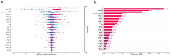 The Shap values of each feature for each prediction were calculated. For each prediction, a positive Shap value indicates an increase in the risk of poor prognosis and vice versa. Figure 3a shows the distribution of Shap values generated by each feature when predicting all samples, and according to its color intensity, it can be seen that as the age increases, the probability of poor postoperative prognosis of patients with sICH increases. The smaller the GCS on admission, the more likely the patient is to have a poor prognosis. Patients with deep ICH and MLS are more likely to have a poor prognosis. In Figure 3b, the average of Shap values of each feature is made into a bar chart, which not only shows the contribution of the feature, but also shows its relative relationship. Other input model features included 22 radiomics features and IVH, but their contribution was lower than age, deep ICH, MLS, and GCS on admission. Higher-order features related to hematoma shape: RadF_2, RadF_4, and second-order features related to image texture: RadF_12, RadF_16, RadF_18, and RadF_19 had a greater weight in predicting the outcome and were higher than the clinical features: Intraventricular Hemorrhage. The second-order feature Gray Level Non-Uniformity Normalized was the most important radiomics feature.
