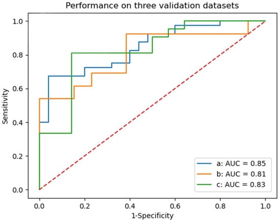 ROC curve of logistic regression model for predicting the prognosis of patients with sICH after surgery in three test sets. a: internal test set; b: external test set 1; c: external test set 2.