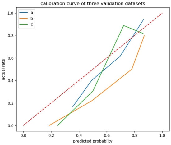 Calibration curve of logistic regression model. Line a: internal test set; Line b: external test set 1; Line c: external test set 2.