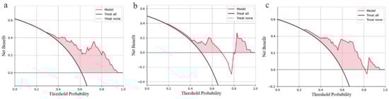 Decision Curve Analysis (DCA) of logistic regression model. (a): internal test set; (b): external test set 1; (c): external test set 2.