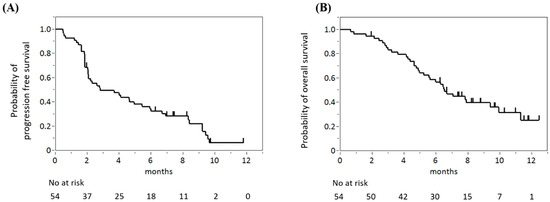 The median PFS was 2.8 months (95% CI 2.0–5.4) and the median OS was 6.6 months (95% CI 5.0–9.4) (Figure 1A,B). The response evaluation for patients with evaluable target lesions (n = 48, 89%) showed a partial response in 6 patients, stable disease in 20, and progressive disease in 21. Response and disease control rates were 12.5% (95% CI 3.1–25.9) and 54.2% (95% CI 40.0–68.3), respectively (Table 2).