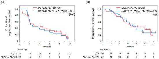 There were no significant differences in PFS and OS between patients with UGT1A1*1/*6 and those with UGT1A1*1/*28 (Figure S1A,B). The median PFS periods were 4.3 months (95% CI 1.3–9.2) in patients with UGT1A1*1/*28 and 2.1 months (95% CI 1.6–6.0) in those with UGT1A1*1/*6 (p = 0.31). The median OS periods were 8.2 months (95% CI 1.6–N.R.) in patients with UGT1A1*1/*28 and 6.4 months (95% CI 2.6–7.9) in those with UGT1A1*1/*6 (p = 0.43), respectively.